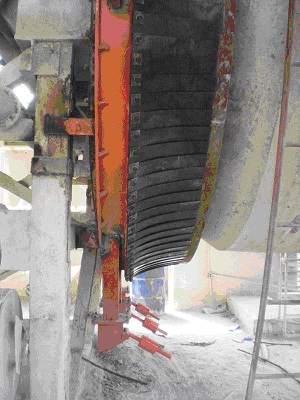 e)這種密封形式可以適應(yīng)回轉(zhuǎn)窯筒體徑向跳動(dòng)、軸向串動(dòng)等問(wèn)題,在筒體變形、偏擺和串動(dòng)的情況下,仍然能夠保證良好的密封,有利于改善窯漏風(fēng),熱工制度很難穩(wěn)定、熟料升重低、結(jié)圈現(xiàn)象,臺(tái)時(shí)產(chǎn)量、熟料質(zhì)量偏低等問(wèn)題。