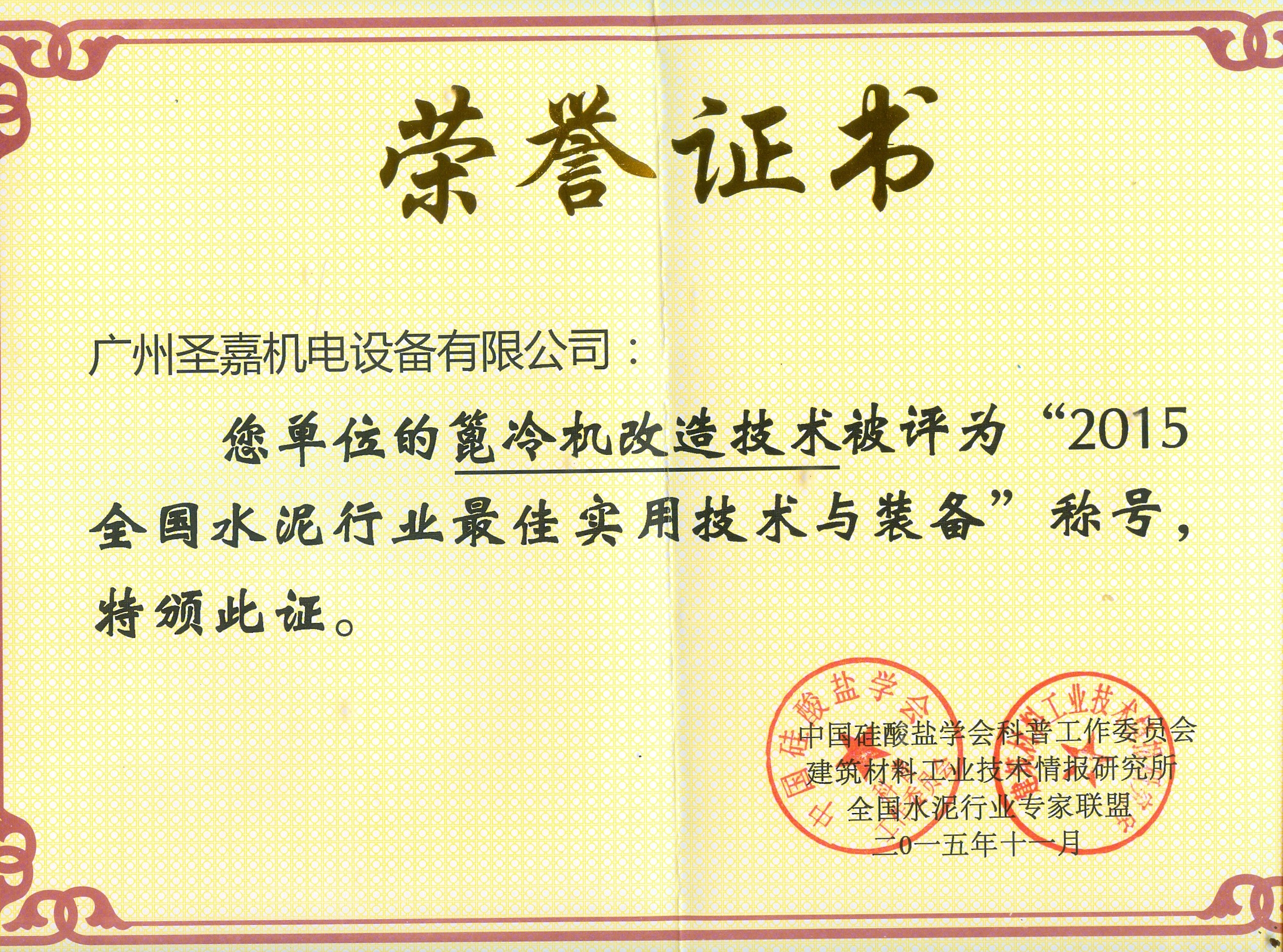 廣州圣嘉機(jī)電設(shè)備有限公司的篦冷機(jī)改造技術(shù)在由中國硅酸鹽學(xué)會(huì)科普工作委員會(huì)、建筑材料工業(yè)技術(shù)情報(bào)研究所、全國水泥行業(yè)專家聯(lián)盟舉辦的2015年“中國水泥技術(shù)年會(huì)暨全國水泥技術(shù)交流大會(huì)”上榮獲全國水泥工業(yè)最佳實(shí)用技術(shù)(BAT),獲得獎(jiǎng)牌并在中國建材報(bào)上公示,同時(shí)入選收錄在由謝克平教授編寫的“高性價(jià)比水泥裝備動(dòng)態(tài)集錦”一書中。